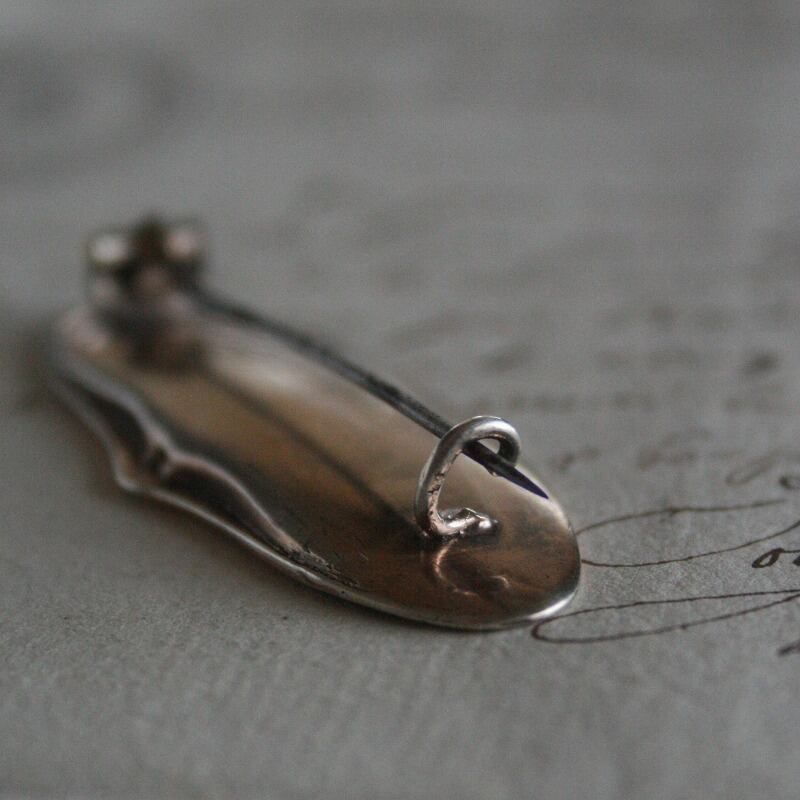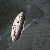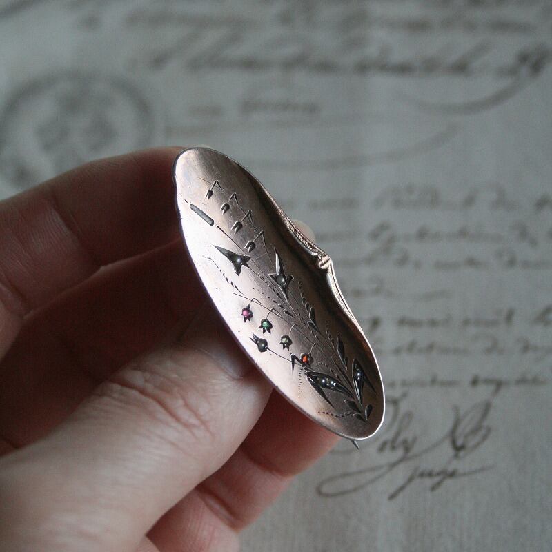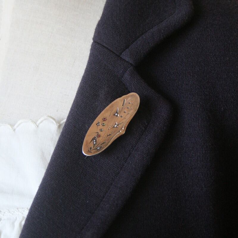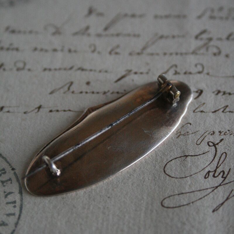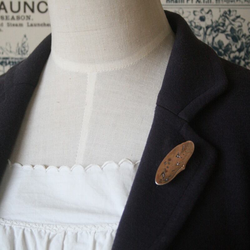 貝のモチーフに湿地帯の植物が描かれた小さなキャンバスのようなブローチ